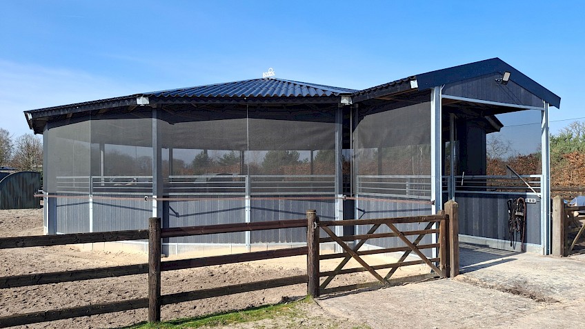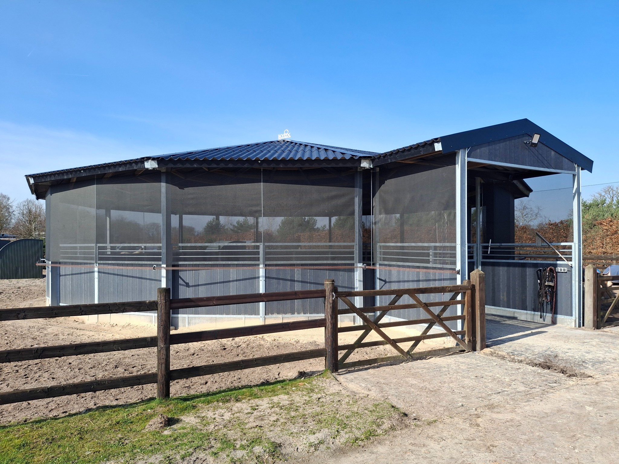 KYLIX-skjermtak beskytter din hest og deg selv mot værforhold som sol, regn og vind, og sørger samtidig for tilstrekkelig med lys og luft, slik at hestene ikke er avskåret fra den ytre verden.